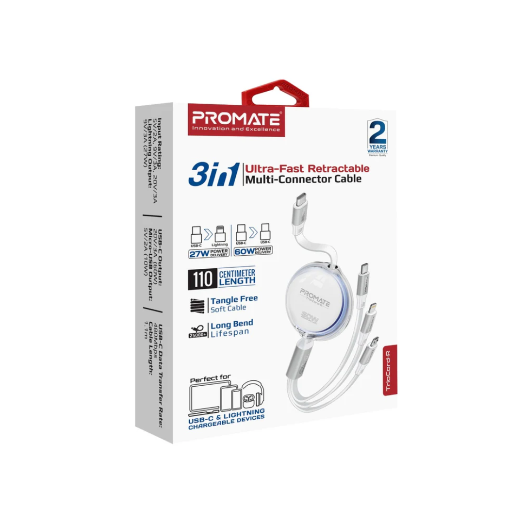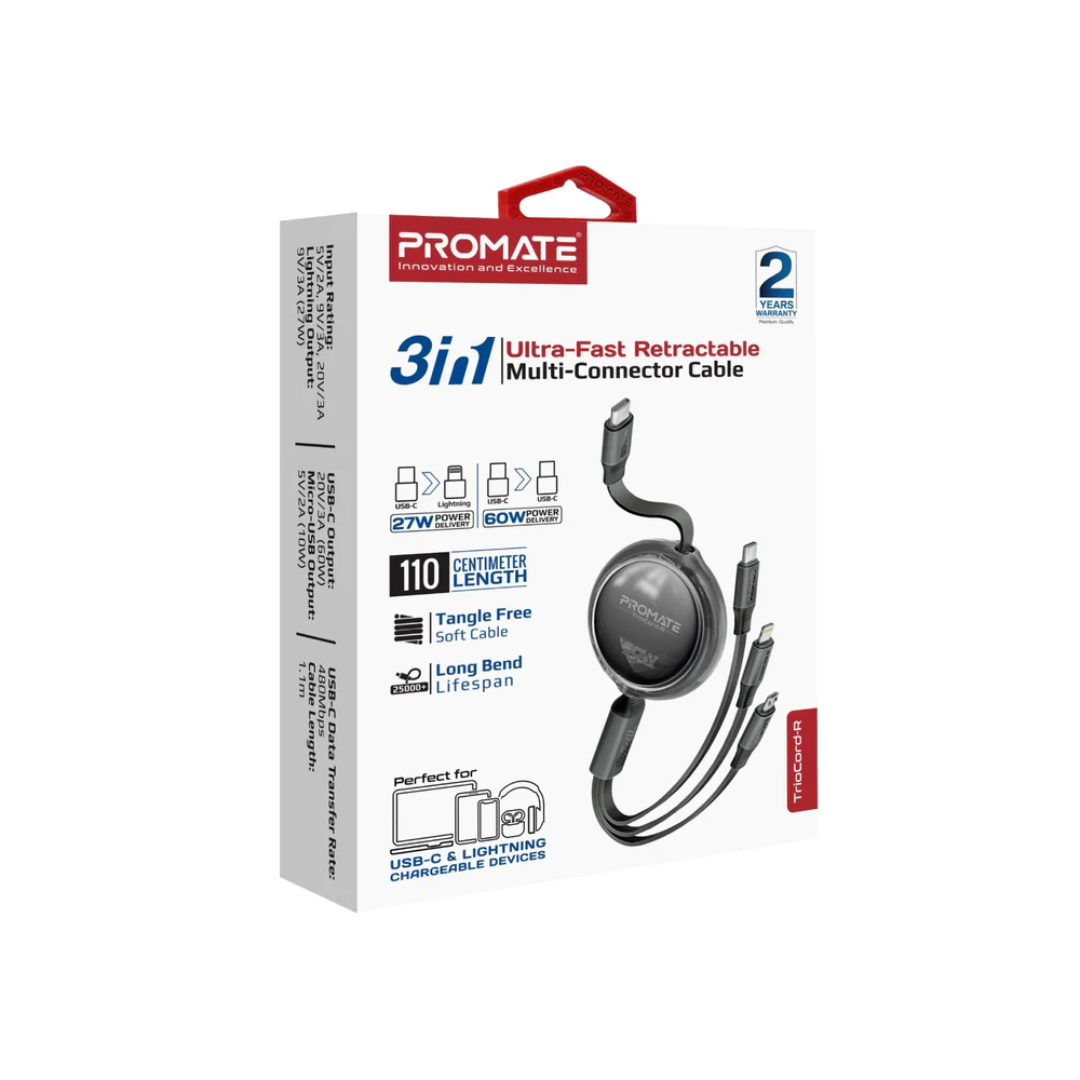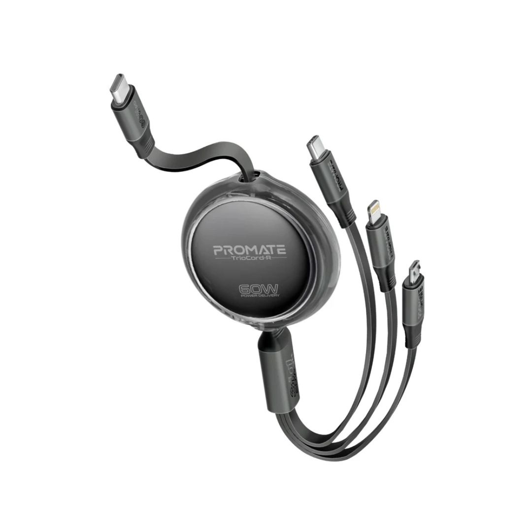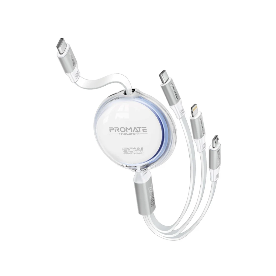 Promate TrioCord-R 3-in-1 Ultra-Fast Retractable Multi-Connector Cable